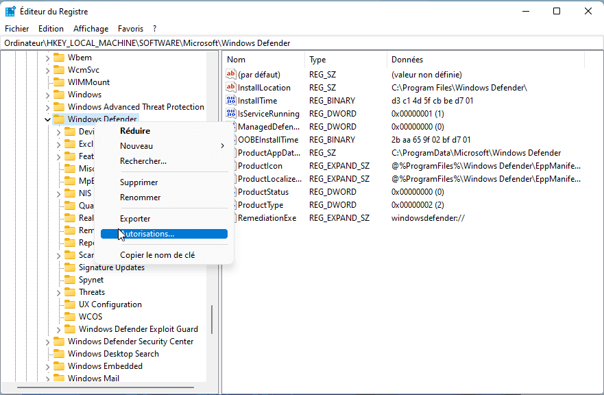 Par défaut, le propriétaire est System. Pour le changer, faites un clic droit sur le dossier et sélectionnez Autorisations. Autorisations de Windows Defender