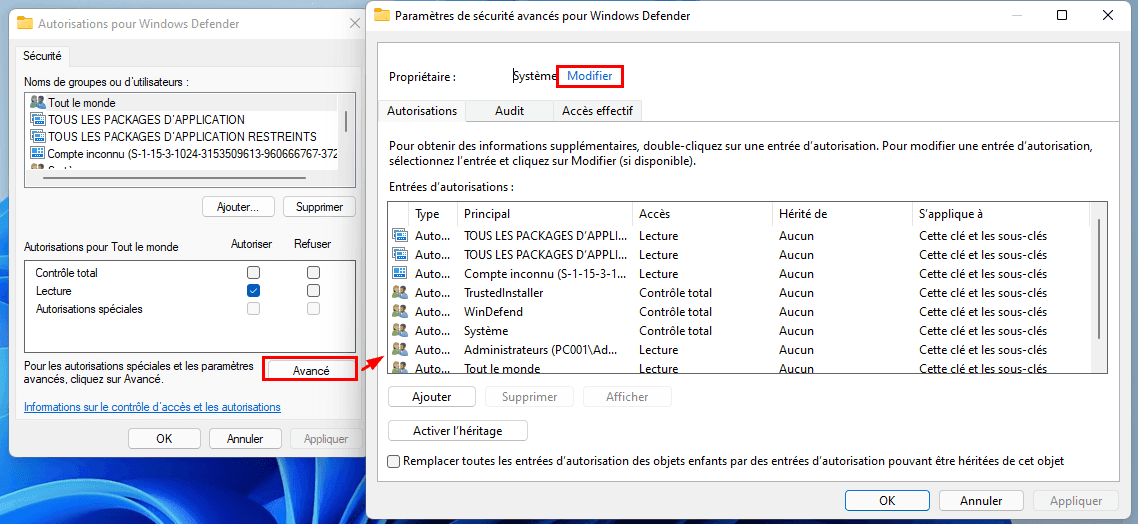 Étape 3. Cliquez ensuite sur l'onglet Avancé dans la fenêtre Autorisations pour Windows Defender. Cliquez ensuite sur Modifier à droite du champ Propriétaire.