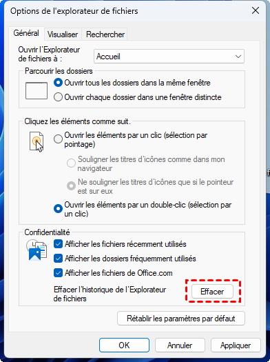 Étape 2. Sous l'onglet Général, cliquez sur Effacer à côté de Effacer l'historique de l'Explorateur de fichiers. N'oubliez pas de cliquer sur Appliquer et ensuite sur OK pour confirmer les modifications.