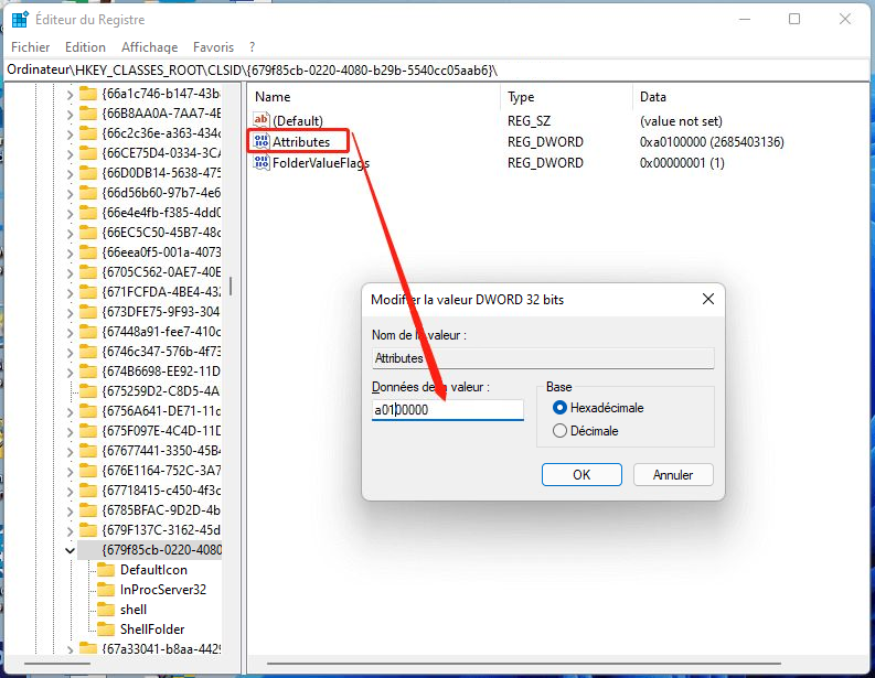 5. Double-cliquez sur Attributes et modifiez la valeur des données en « a0100000 », puis cliquez sur OK.