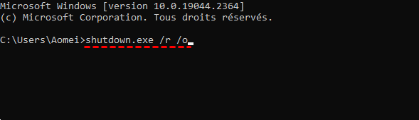 2. Dans la fenêtre d'invite de commande, tapez la commande shutdown.exe /r /o et appuyez sur Enter pour l’effectuer.