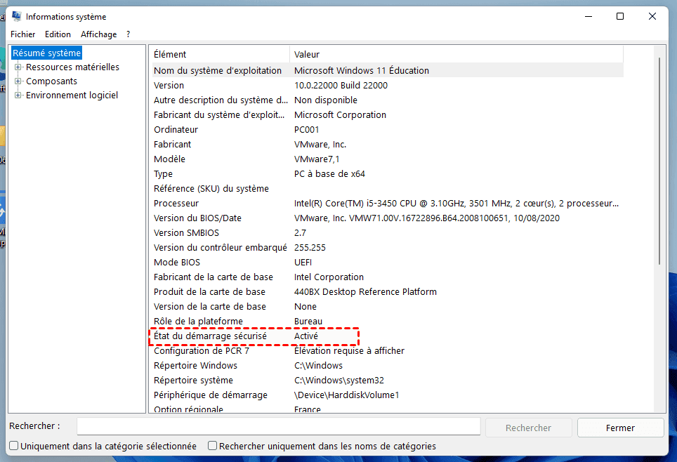 - Cliquez sur le bouton Démarrer et recherchez Informations système. Dans Résumé système, localisez État du démarrage sécurisé.