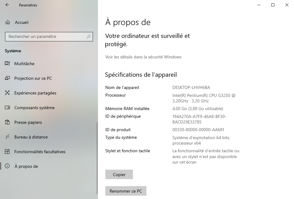 Étape 1. Cliquez sur Démarrer > Paramètres > Système > À propos de. Vous y verrez les caractéristiques principales de votre PC, comme le processeur, la mémoire RAM et le type de système (32 ou 64 bits).