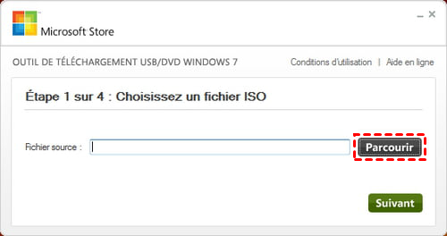 Étape 1. Branchez votre clé USB et exécutez l'outil de téléchargement USB/DVD Windows 7, puis, cliquez sur le bouton « Parcourir » pour choisir votre fichier ISO. Ensuite, cliquez sur « Suivant ».