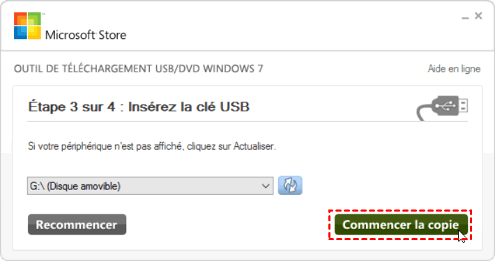 Étape 3. Insérez votre clé USB dans l'ordinateur et sélectionnez-la. Ensuite, cliquez sur « Commencer la copie ».