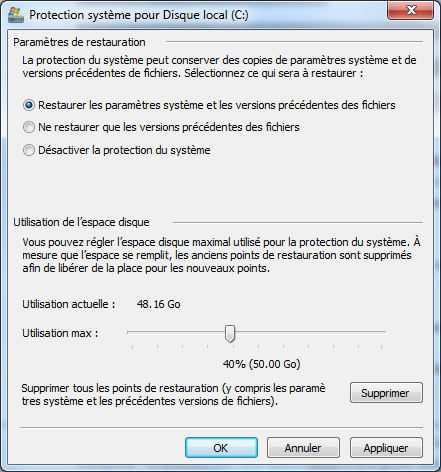 Remarque : étant donné que les points de restauration sont créés régulièrement, cela prendra beaucoup d’espace sur votre ordinateur. Pour éviter problème d’espace disque insuffisant, il est judicieux de régler l’espace disque maximal utilisé pour la protection du système. Au fur et à mesure que l'espace se remplit, les anciens points de restauration seront automatiquement supprimés pour fairer de la place aux nouveaux.