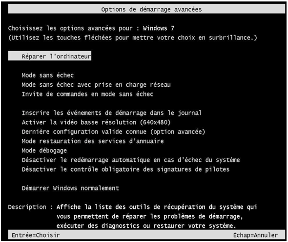 Dans l'écran Options de démarrage avancées, sélectionnez Réparer l'ordinateur. Ensuite, sélectionnez la langue du clavier. À la fenêtre suivant Options de récupération système, choisissez Réparation du démarrage.