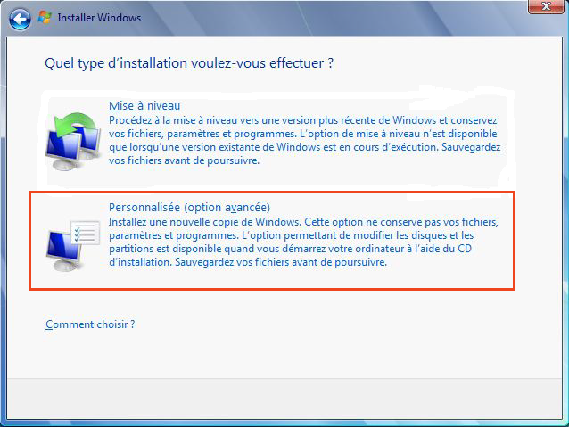 Étape 4. Sélectionnez le type d'installation de Windows 7 : Personnalisée.