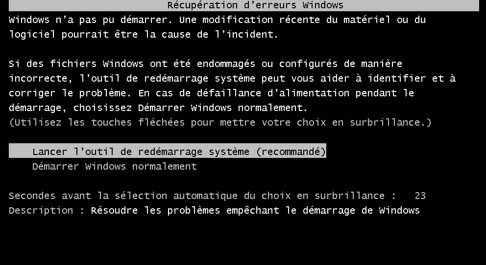 Lorsque votre ordinateur Windows 7 ne démarre pas ou a des problèmes de démarrage, il exécute automatiquement « Réparation du démarrage » et essaie de résoudre le problème. Vous verrez l'écran « Récupération d'erreurs Windows » comme illustré ci-dessous. Vous pouvez choisir Lancer l'outil de redémarrage système (recommandé) pour faire la réparation du démarrage.