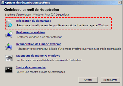 Ensuite, vous pouvez l'utiliser pour lancer « Réparation du démarrage ». De plus, si le démarrage de Windows 7 ne fonctionne toujours pas, vous pouvez essayer d'autres options de récupération, telles que « Restaurer le système ».