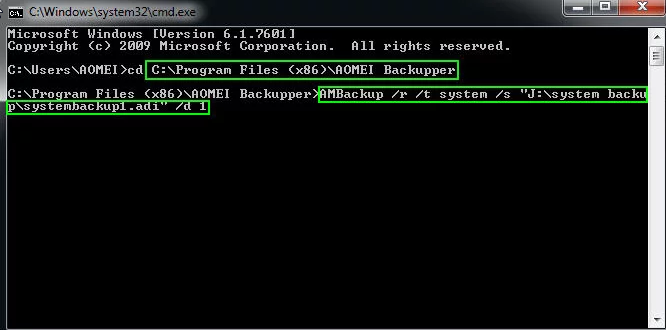 AMBackup /r /t system /s “J:\system backup\systembackup1.adi” /d 1