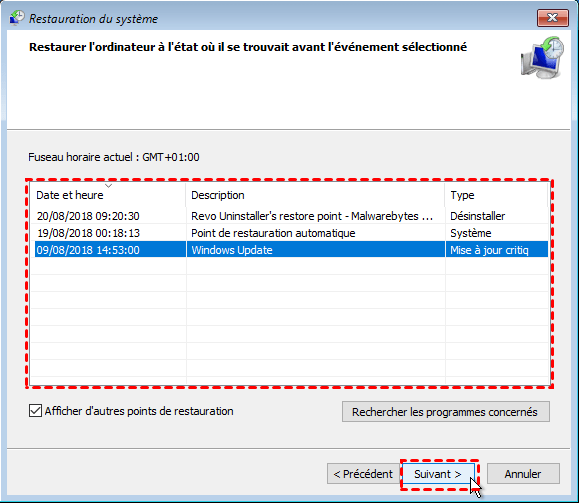 4. Choisissez un point de restauration système que vous souhaitez restaurer, cliquez sur Suivant.