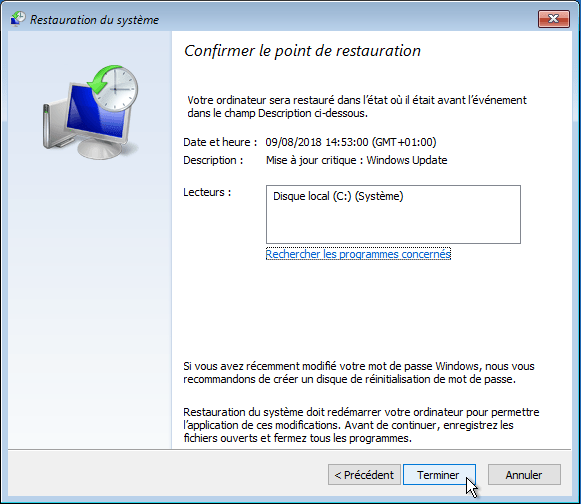 5. Prévisualisez et confirmez le point de restauration que vous avez actuellement choisi, cliquez sur Terminer pour commencer à récupérer le profil utilisateur supprimé dans Windows 7.