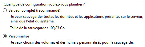 4. Cochez Personnalisé pour la configuration de sauvegarde et cliquez sur Suivant.