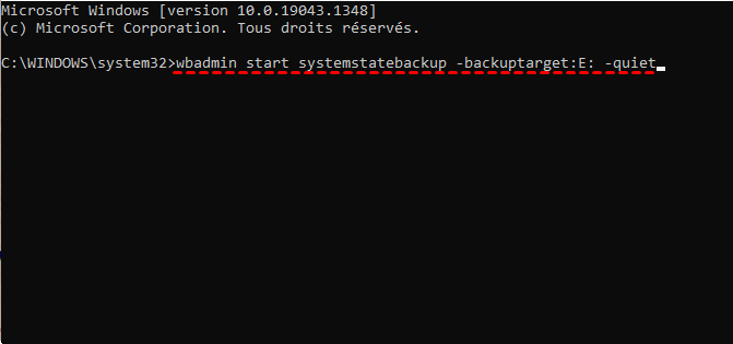 La première méthode consiste à utiliser l'outil de ligne de commande Wbadmin pour créer un point de restauration Windows Server 2022. Cette méthode est conviviale pour les techniciens ainsi que pour les experts en informatique. Mais c'est un peu compliqué pour la plupart des utilisateurs. Vous pouvez choisir les deux dernières méthodes plus simples. Voici les étapes de la première méthode.