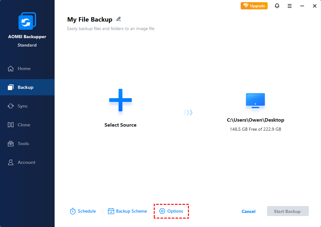 When creating a new backup task, you will see "Options" in the lower left corner of the interface.