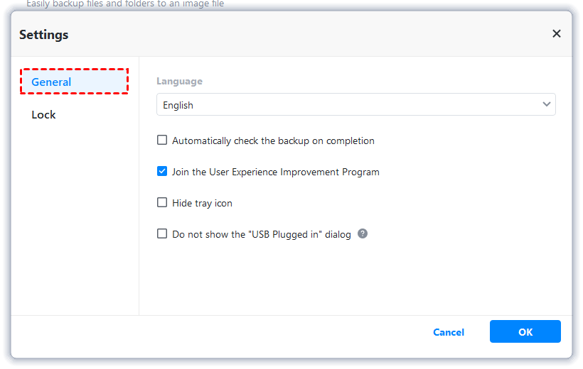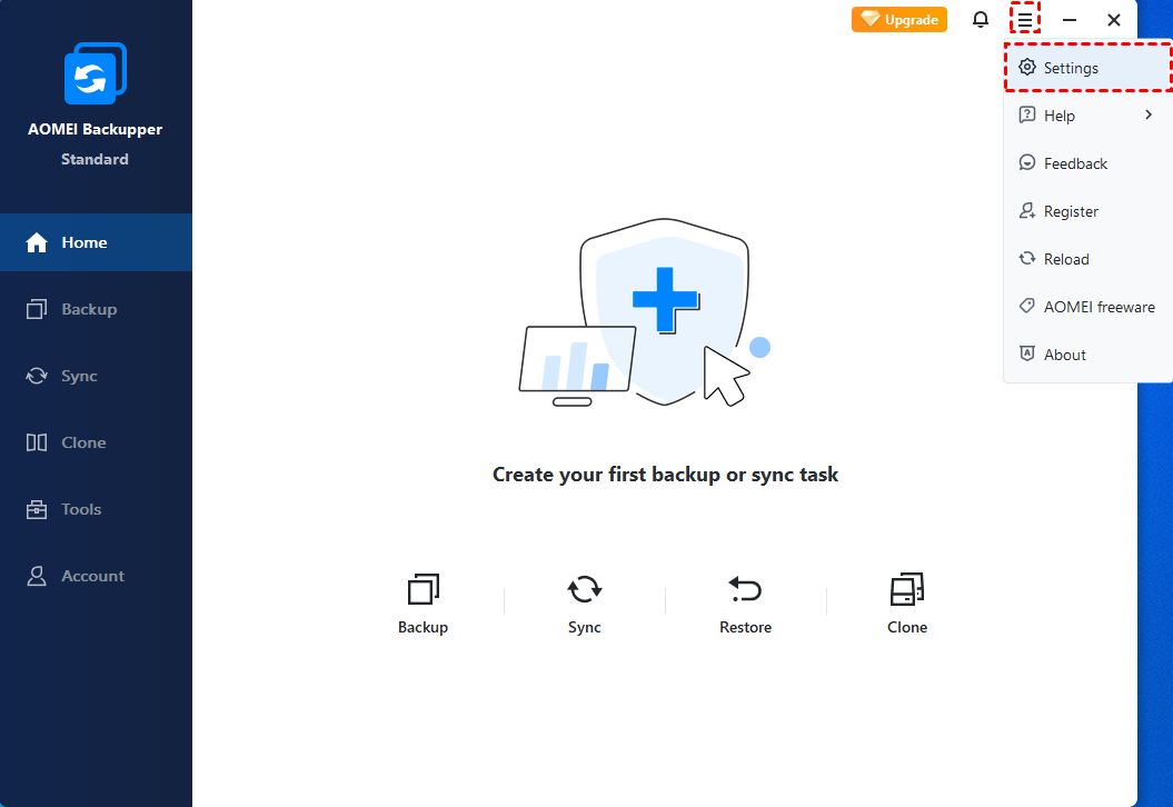 You can find the "Options" button in the Backup page for the specific backup task, like compression level, splitting image, notifications settings, intelligent sector, VSS, etc. In the program's main "Menu"-->"Settings", it is possible to individually customize the global parameters, like automatically check the backup on completion, hide tray icon, and so on.
