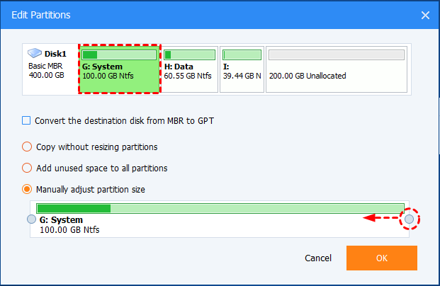 Manually adjust partition size: Manually adjust the partition size by dragging a slider bar. With this feature, you can simply select and modify the size of every partition as your requirements.