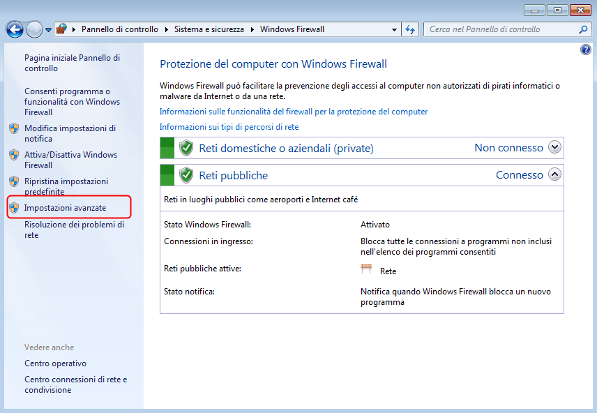 1. Vai Start > Pannello di controllo > Sistema e sicurezza >Windows Firewall e trova Impostazioni avanzate sul lato sinistro.