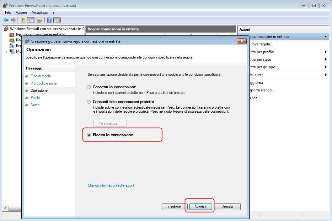 3. Scegli Blocca la connessione > Avanti. Spunta le tre caselle di controllo e fai clic su Avanti. Specifica il nome e la descrizione a piacere e fai clic su Finito.