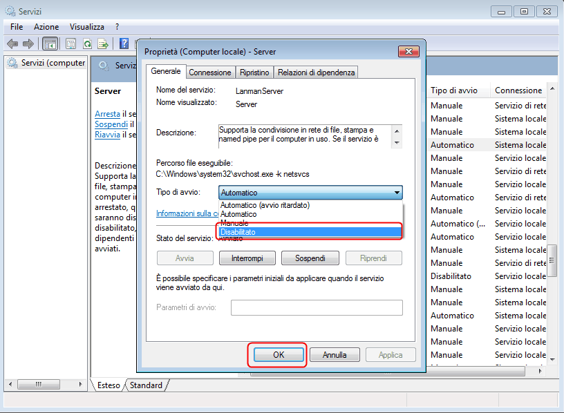 *Se si desidera abilitare o aprire la porta 445 in Windows 7 in futuro, è sufficiente eliminare la nuova regola creata in Windows Firewall oppure modificare i dati del valore da 0 a 1 oppure eliminare semplicemente il valore nell'Editor del Registro di sistema o passare Disabilitato in Automatico in Proprietà del server.
