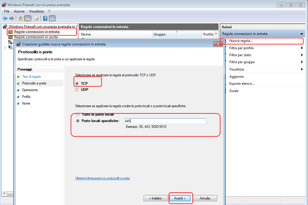 2. Fai clic Regole connissioni in entrata > Nuova regola. Quindi, nella finestra pop-up, scegli Porta > Avanti >TCP > Porte locali specifiche e digita 445 e vai Avanti.