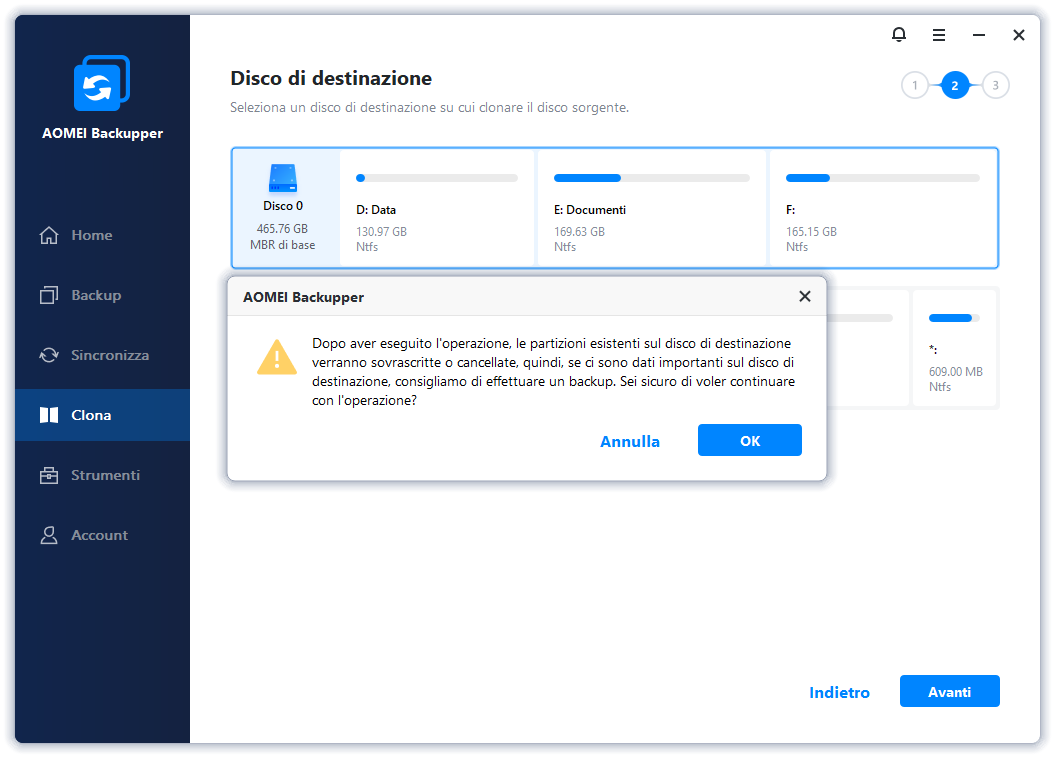 Passo 3. Fai clic su OK nella finestra del messaggio di avviso. Se non hai un backup per i tuoi dati importanti sul disco didestinazione, puoi prima fai clic su Annulla ed esegui il backup dei dati.
