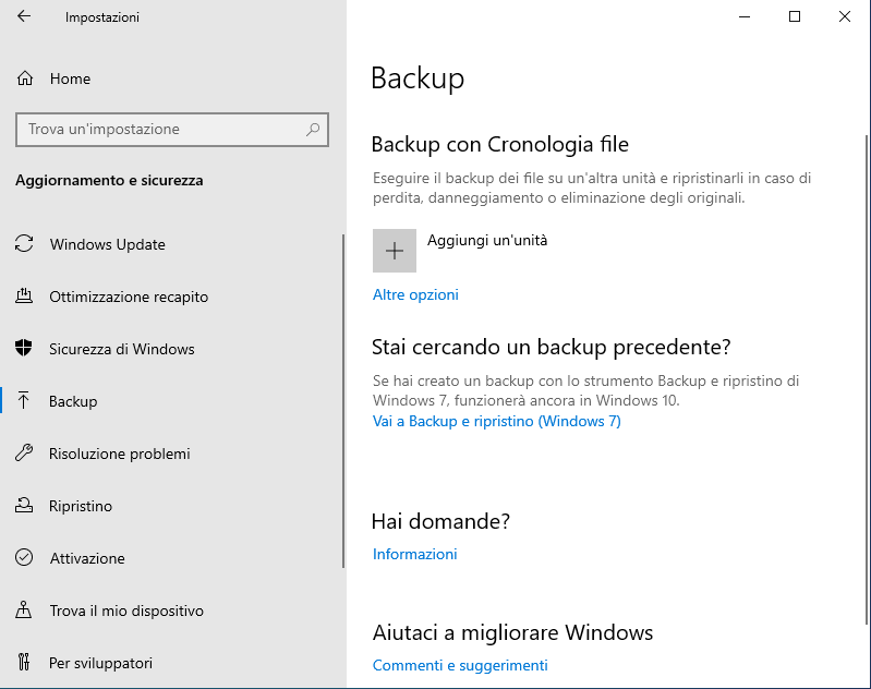 1. Cerca Impostazioni di backup e selezionalo. Successivamente, clicca su Aggiungi un'unità sotto Esegui il backup tramite Cronologia file e seleziona il disco rigido esterno che hai collegato.