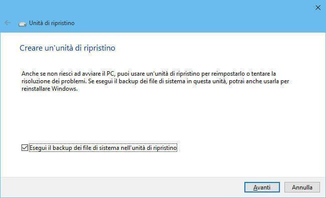 Nota: se selezioni Esegui il backup dei file di sistema nell'unità di ripristino, avrai la possibilità di reinstallare il computer in un momento cruciale.