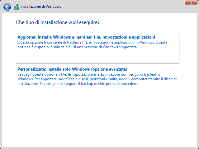 7. Seleziona il tipo di installazione di Windows 10: Personalizzata.