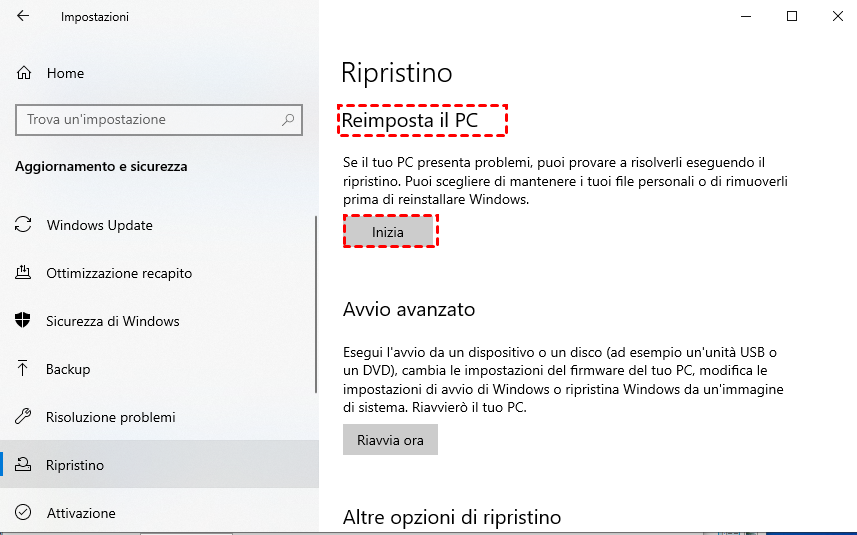1. Fai clic su "Start" > "Impostazioni" > "Aggiornamento e sicurezza" > "Ripristino".