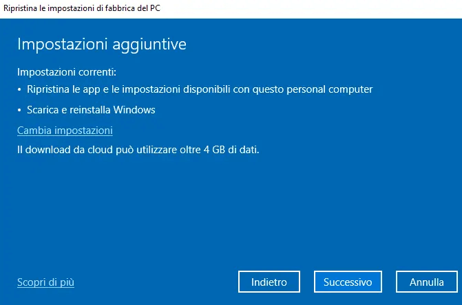 6. Nella finestra "Pronto per ripristinare le impostazioni di fabbrica del PC", fai clic su "Ripristina" per pulire il PC.