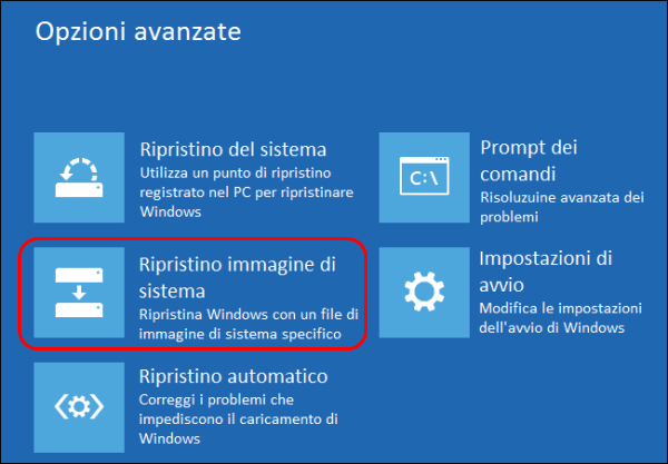 Per poter eseguire il ripristino dell'immagine di sistema, è necessario creare almeno un backup dell'immagine di sistema accessibile al computer da ripristinare. Se non riesci nemmeno ad avviare il computer nell'ambiente di ripristino, puoi creare un dsico di ripristino sul computer con lo stesso hardware o utilizzare direttamente il DVD di installazione di Windows.