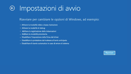 2. Nell'ambiente di ripristino, fa clic su Risoluzione dei problemi > Opzioni avanzate > Altre opzioni di ripristino > Impostazioni di avvio, poi fa clic su Riavviare.