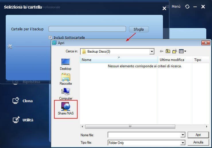 Passo 2. Clic Agg Cartelle. Perché stiamo parlando del backup del Synology NAS sul disco rigido esterno, seleziona Share/NAS nella finestra pop-up.
