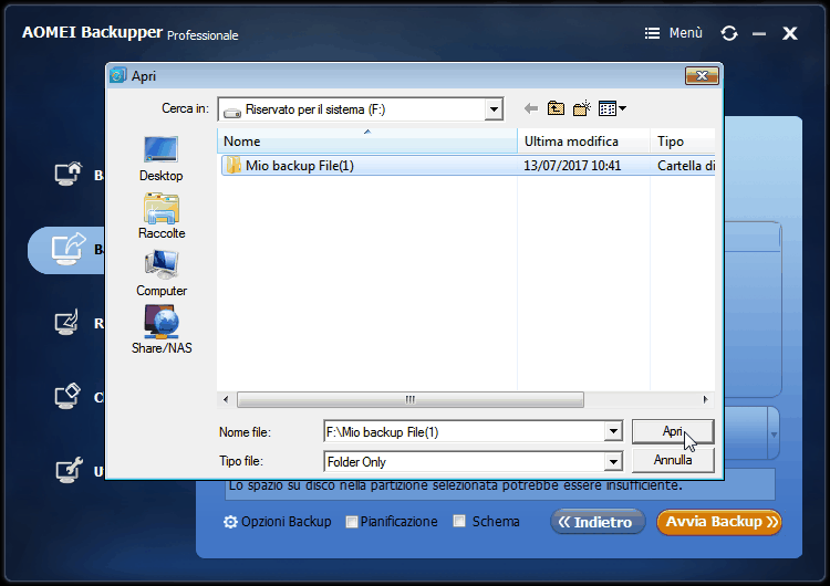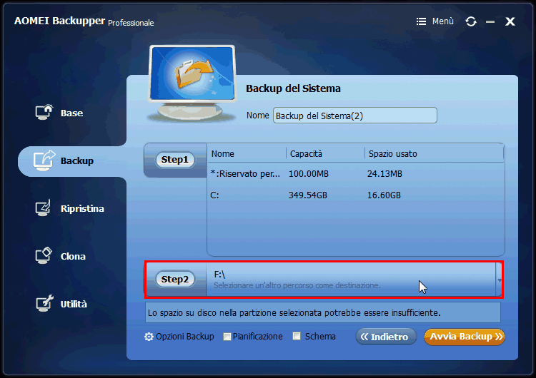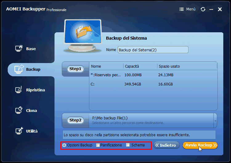 È giunto il momento di rivolgersi al software di terze parti quando gli strumenti incorporati di Windows non possono soddisfare le tue esigenze. AOMEI Backupper Professionale è un programma di backup e ripristino affidabile e completo, progettato per sistemi operativi Windows come Windows 7, 8, 10, 8.1, Vista e Windows XP. Supporta il sistema di backup su HDD, SSD, SSHD, hard disk esterno (USB 1.0/2.0/3.0), scheda PC, unità flash e pollice ecc. Il backup completo, il backup incrementale e il backup differenziale sono disponibili in BackupOpzioni. La funzionalità di Backup del Sistema è eseguita con un'unica operazione di scatto, il che significa che selezionerà automaticamente Sistema di Azionamento (unità C) e partizione di riserva di sistema per te. Non c'è bisogno di preoccuparsi se si dimentica qualcosa ogni volta. ScaricaAOMEI Backupper Professionale per provare.