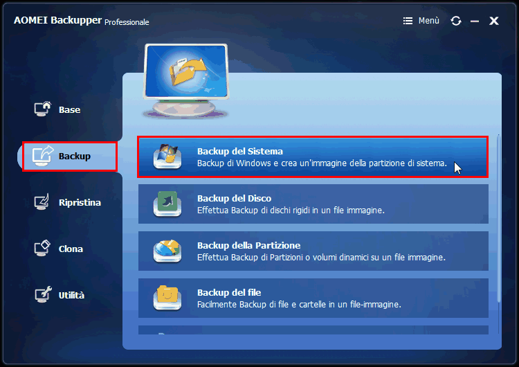 1. Installa e avvia AOMEI Backupper Professionale. Va Backup e poi Backup del Sistema.
