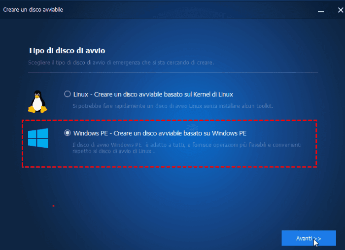 Passo 2. Scegli il dispositivo di avvio USB. Premi Avanti per creare un supporto avviabile di Windows 7/8/10/11. Puoi anche masterizzare il WinPE su CD/DVD o esportare in un file ISO.