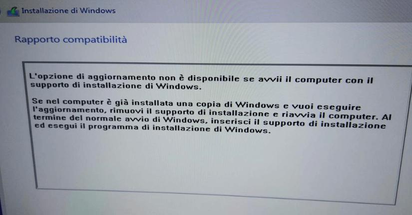Ho già pulito il mio computer e ora devo solo installarlo. Ma ogni volta che provo, compare un messaggio che dice: 'Rapporto di compatibilità L'opzione di aggiornamento non è disponibile se si avvia il computer utilizzando il supporto di installazione di Windows. Se è già presente una copia di Windows su questo computer e si desidera eseguire l'aggiornamento, rimuovere il supporto di installazione e riavviare il computer. Dopo che Windows è stato avviato normalmente, inserire il supporto di installazione ed eseguire l'installazione di Windows'.
