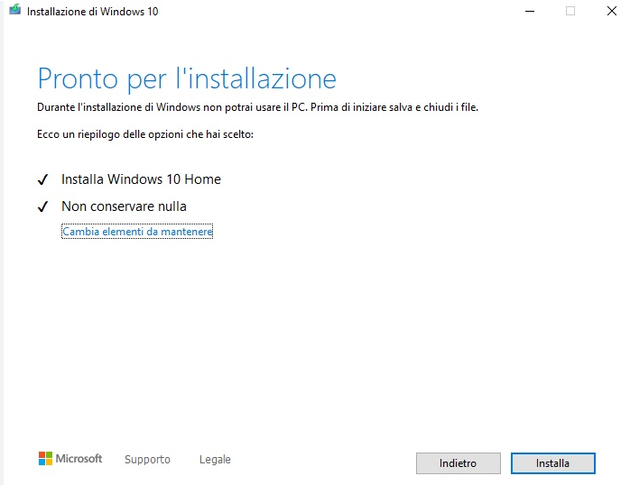 8. Quando Windows 10 è pronto per l'installazione, vedrai un riepilogo di ciò che hai scelto e di ciò che verrà mantenuto durante l'aggiornamento. L'opzione Mantieni file personali e app è selezionata per impostazione predefinita, e puoi cambiarla cliccando su Cambia cosa mantenere.