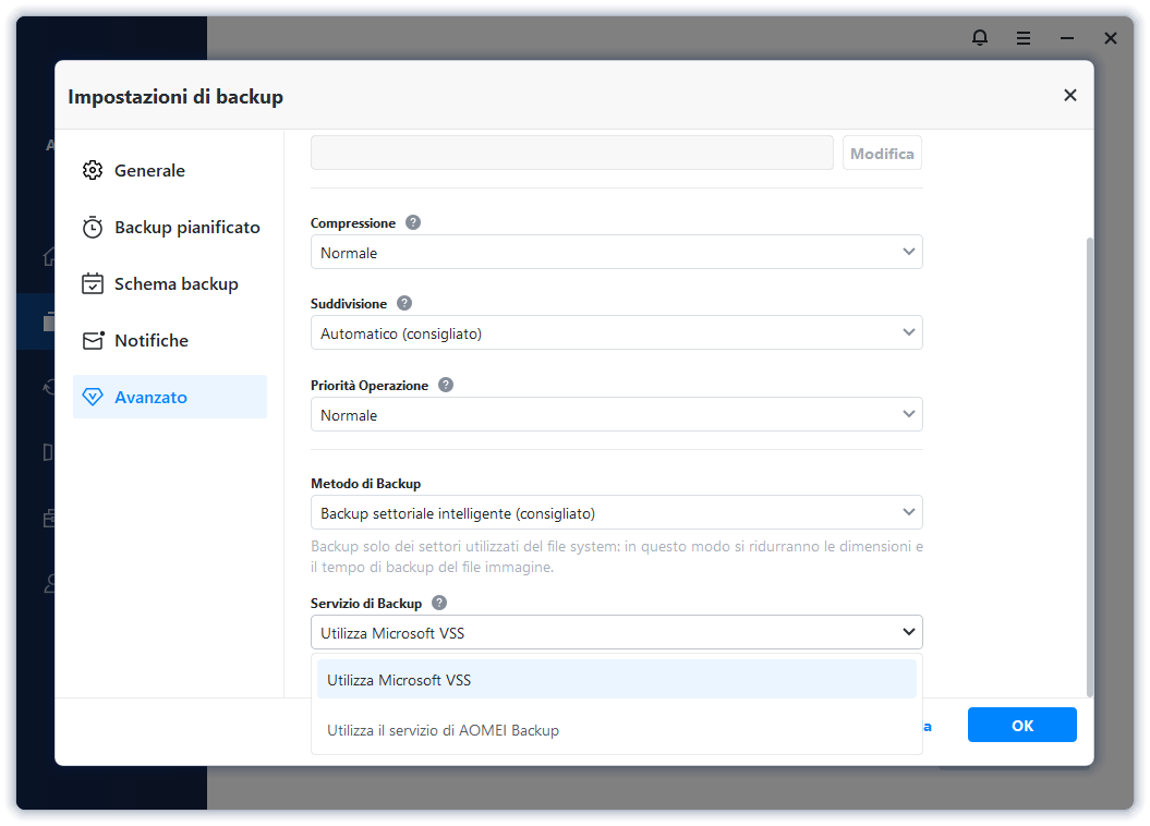 Passaggio 3. Seleziona i servizi VSS. Clicca su "Opzioni", vai a "Backup Modalità" e seleziona "Utilizza il servizio di AOMEI Backup" anziché "Utilizza Microsoft VSS".