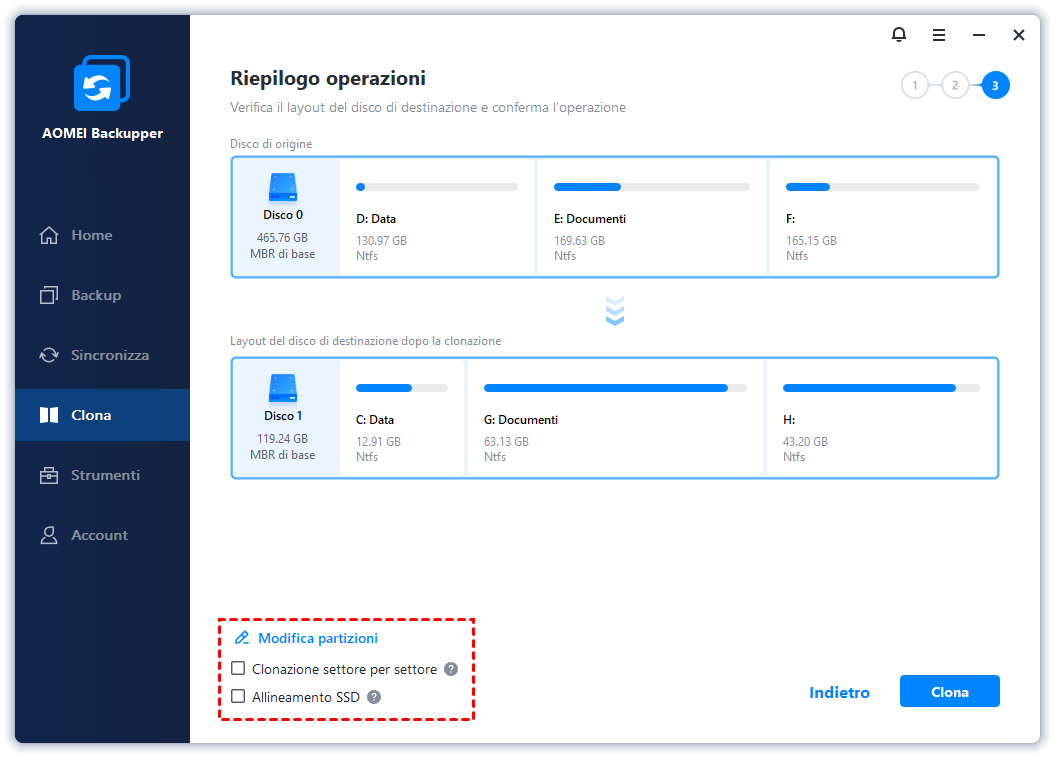 Ma se la tua situazione è simile al caso di sopra, sei molto fortunato a trovare AOMEI Backupper Standard. Consente di clonare HDD più grandi su SSD più piccoli purché l’SSD abbia spazio sufficiente per contenere i dati sugli HDD.
