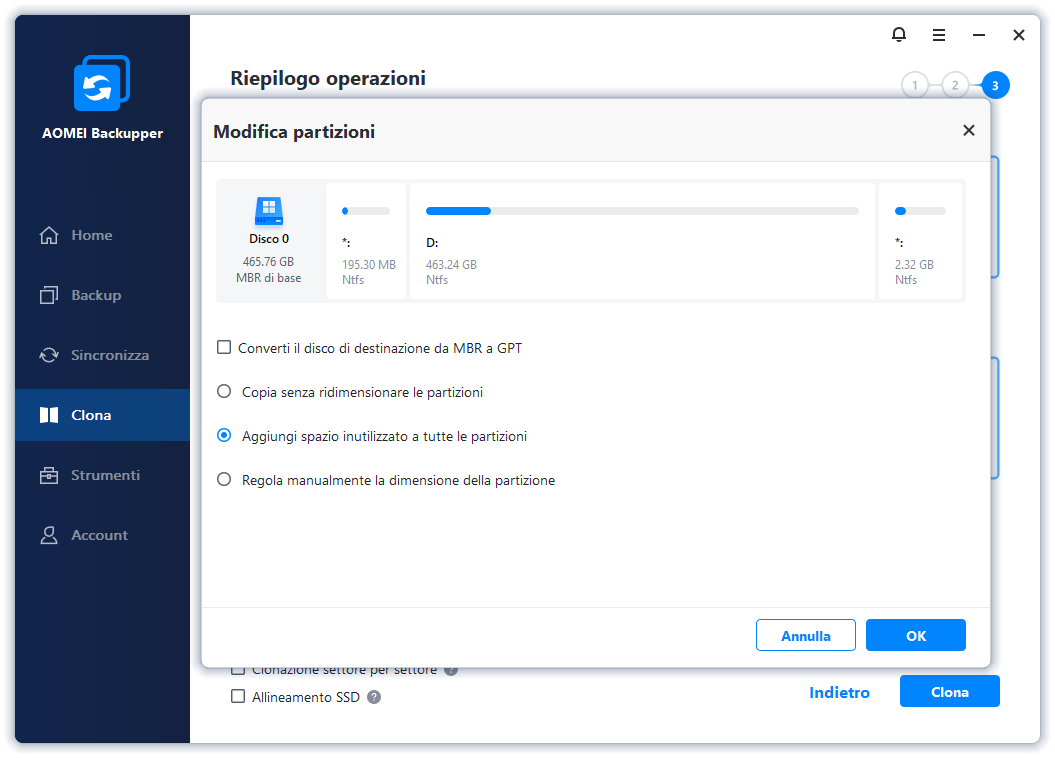 ✎ Regola manualmente le dimensioni della partizione: Permette di estendere lo spazio non allocato a qualsiasi partizione del disco di destinazione.