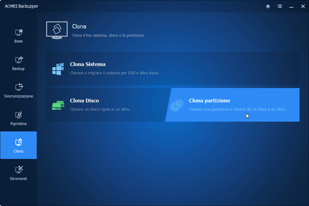 Ti offre opzioni per clonare l'intero disco, partizioni selezionate o solo il sistema operativo. |