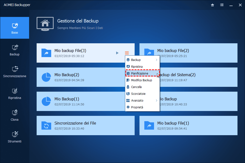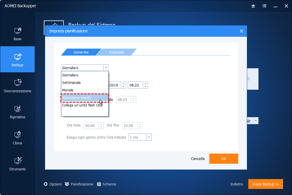 Oltre alla base pianificare i backup, AOMEI Backupper può rilevare eventi specifici e creare un backup quando si verificano.