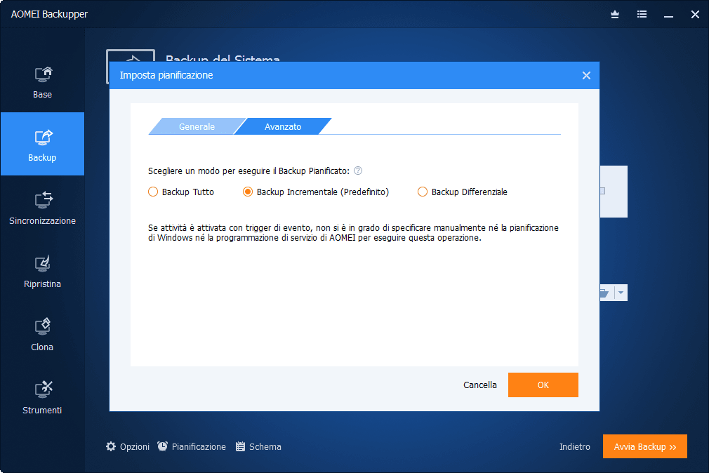 Suggerimenti: è anche possibile clic "Avanzato" scheda per scegliere un modo per eseguire il backup del sistema attivazione eventi. L'opzione predefinita è "Backup Incrementale" che backup solo i nuovi dati aggiunti, modificati e cancellati in base all'ultimo backup. Anche puoi cambiare "Backup Tutto" o "Backup Differenziale"(Per AOMEI Backupper Pro).