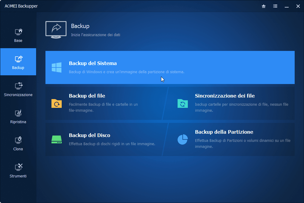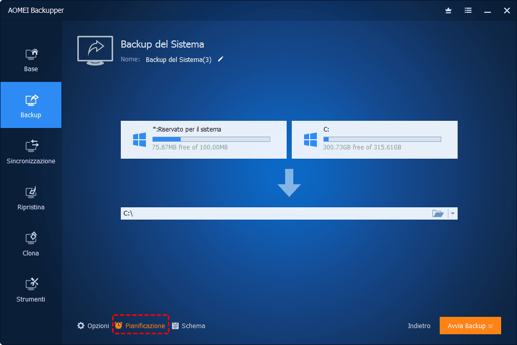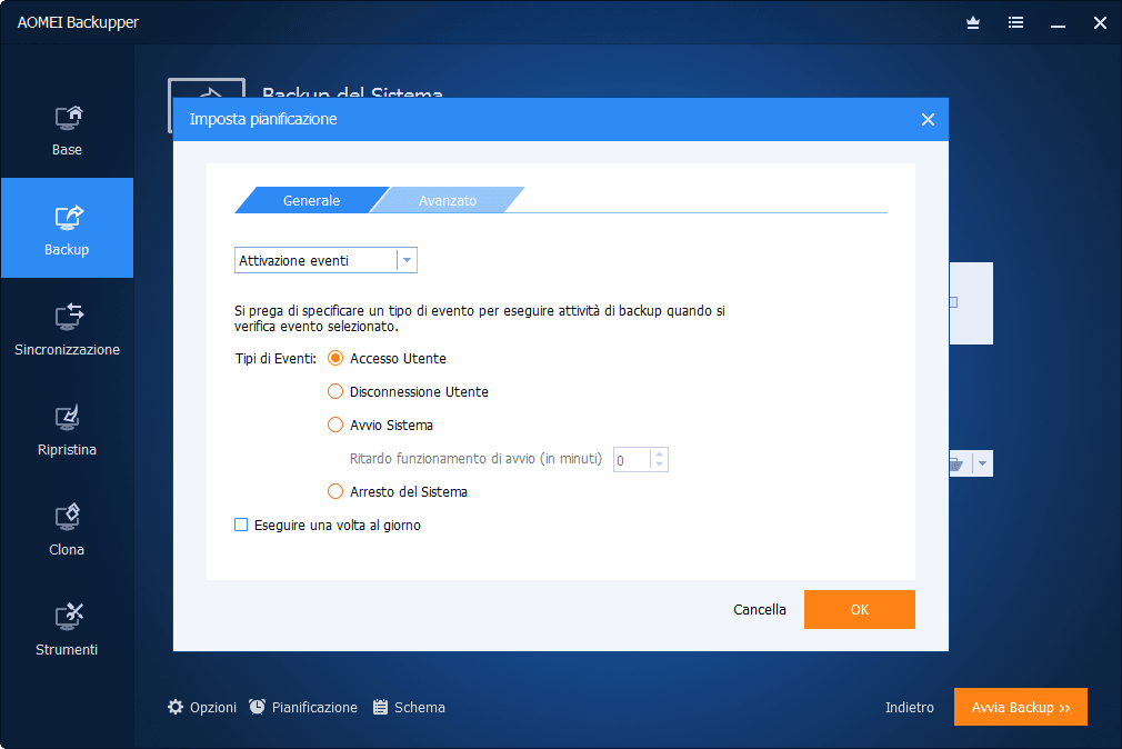 Avvio sistema: Prima di apportare modifiche al computer dopo l'avvio del sistema, è'meglio programmare un backup automatico dopo aver avviato il computer. È possibile determinare quanti minuti dopo l'avvio del sistema per eseguire il backup.