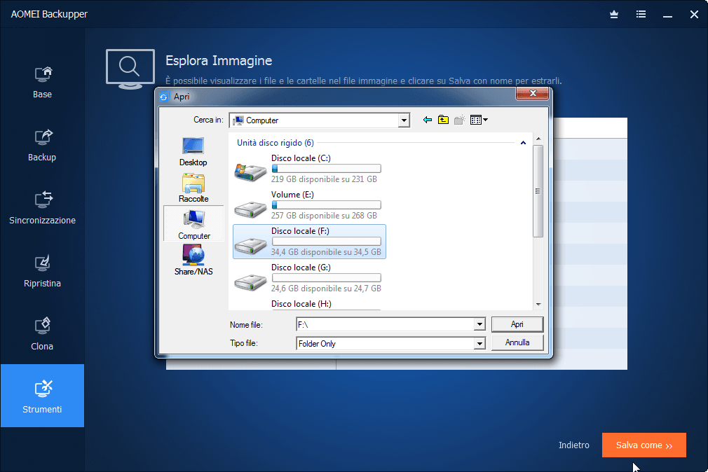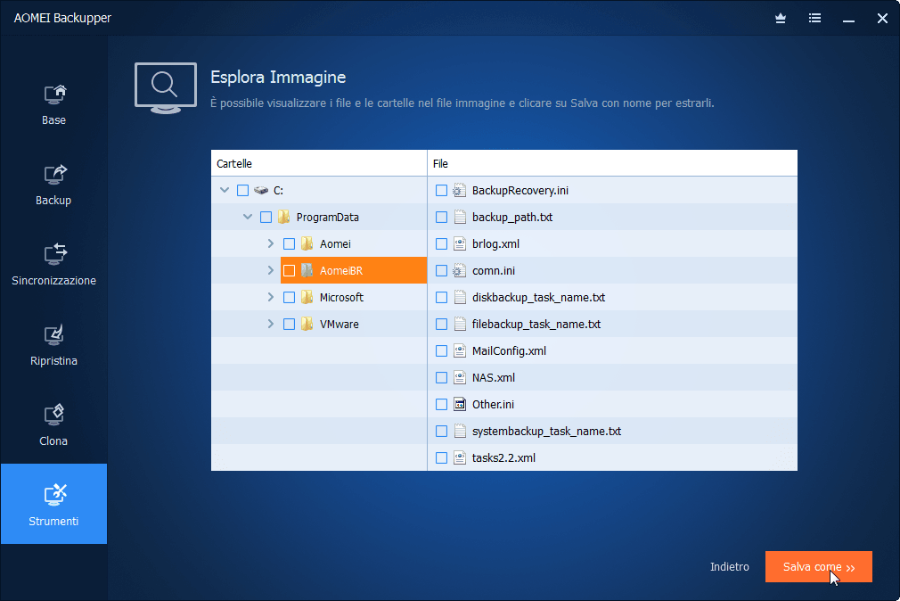 AOMEI Backupper è un potente software di backup e ripristino, che è gratuito. Puoi utilizzare la funzione "Esplora Immagine" per verificare i file di immagine. Inoltre, puoi montare l'immagine per una partizione in "Computer" e ripristinare i file necessari.