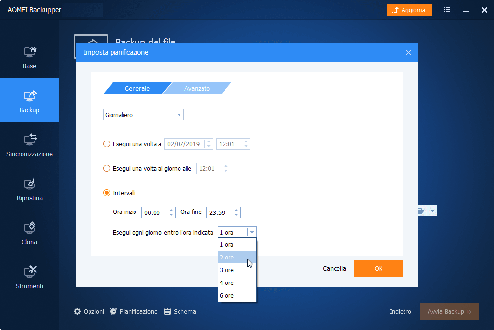 Nella modalità giornaliero, possiamo scegliere un determinato periodo di tempo per il backup automatico. Oppure possiamo impostare un intervallo di tempo innanzitutto, poi scegliere intervallo per ogni backup.