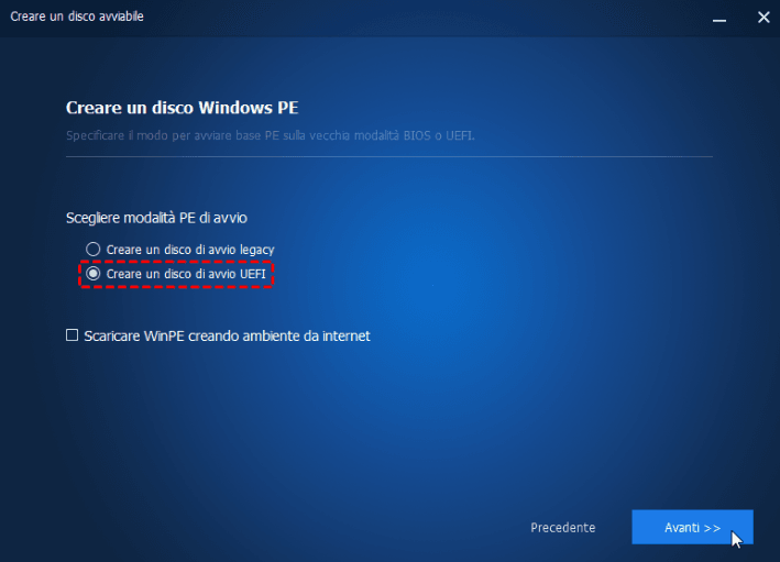 "UEFI Ripristino Nota: il tuo sistema è UEFI boot (non MBR boot), quindi è necessario utilizzare avviabile media di AOMEI per realizzare operazione di ripristino. Vai a Utilità -> Crea supporti di avvio e crea un CD avviabile o USB media, e utilizza avviabile media di avvio tuo computer per completare attività di ripristino."